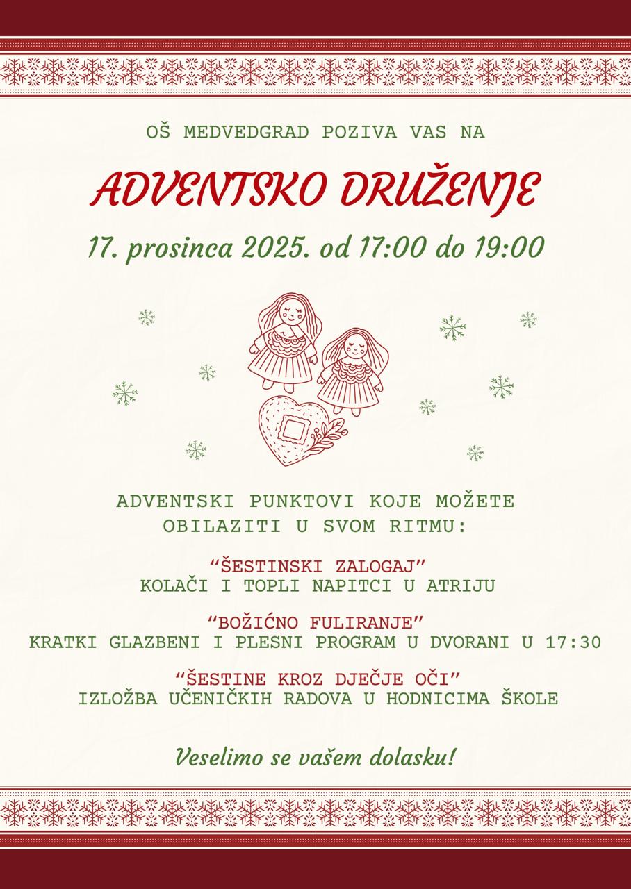 pozivamo vas na Adventsko druženje koje će se održati u našoj školi 17. prosinca 2025. od 17:00 do 19:00 sati.